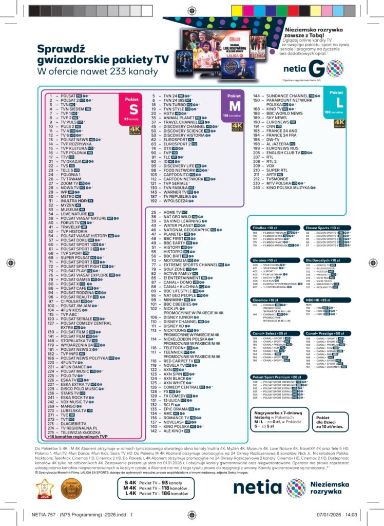 Zyskaj dostęp do 242 kanałów dostępnych w trzech konfiguracjach – S, M oraz L, dopasowanych do Twoich potrzeb. Filmy, sport, dokumenty, wiadomości i bajki dla dzieci w jakości HD i 4K.